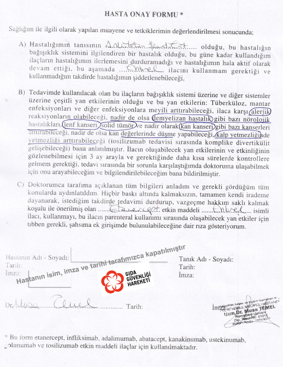 İsmi bizde mahfuz bir hasta, tıpta “Ankilozan Spondilit” denilen omurga (kemik) eğriliği hastalığı için doktora gider. Özel hastanenin doktoru bu hastaya, aşağıdaki belgeyi imzalatıp sözde bir ‘ilaç’ verir.